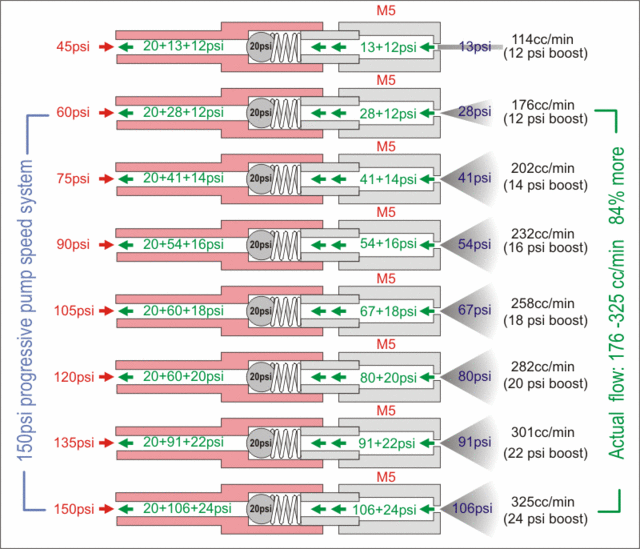 - When the PPS system arrives at 24psi boost (end point) manifold pressure, the dynamic pressure is now further taxed. Before too long later the dynamic range of a PPS system is now from 62psi to 126psi – translate it to flow: 176cc/min to 326cc/min, a mere 84% percent increase.