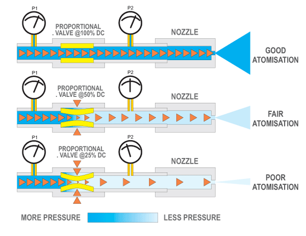 Generally, it will deliver liquid comparable to a PPS system as there are some similarities between the two. The nozzle tip pressure is directly proportional to the flow. This is because the proportional valve acts as a variable restriction upstream of the nozzle tip. This results in restricted flow which equals low pressure. And low pressure equals poor atomization.