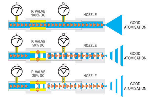 - PWM-V system: constant pressure at any flow equals consistent atomization (see video).