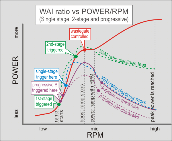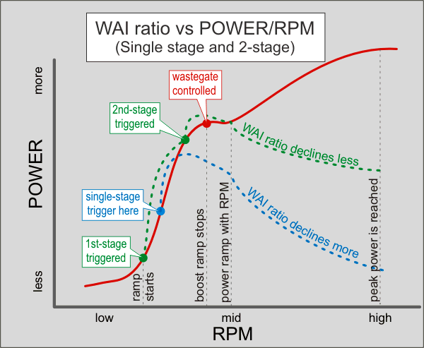 As the RPM climbs, the ratio of water to mass air tends to decrease. This may not be a bad thing because the tendency to knock is also lessened as the waste gate starts to open and prevent the boost pressure from increasing further. The volumetric efficiency of the engine also decreases as RPM climbs, breathing in less air. This also has the effect of reducing the engine’s tendency to knock and demand of WAI flow is less. Unfortunately some engines can require continuous WAI flow at higher RPM due to heat build up through friction and turbo efficiency.