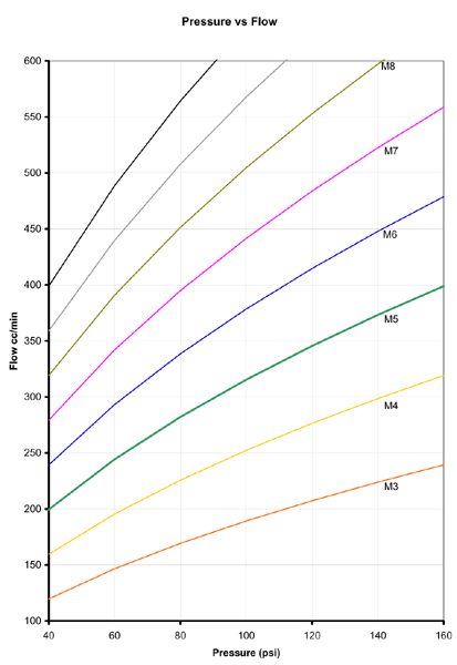 A swirling-type atomizing nozzle requires a head pressure of at least 30psi to produce a decent mist. Droplet size is very important to the inlet cooling capability as well as even cylinder distribution. Let’s say the system pressure begins at 40psi (as shown on the chart) and ends at 160psi. In theory, one could assume a 4x flow range, but in practice, this isn’t the case. According to the chart, only a flow change from 200cc/min to 400cc/min (see M5) can be achieved instead of 200cc/min to 800cc/min. Flow/pressure obeys the square-root law.