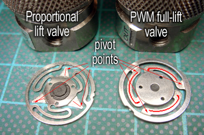 This is an illustration of the difference in construction between the two valves, both made by Clippard. Notice the “PWM” (full on/off”) has a softer spring rate than the “proportional lift” valve, enabling the PWM valve to perform “full on” and “full off” positively.