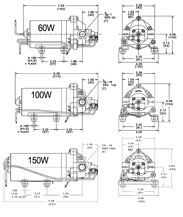 - From a reputable PPS system manufacturer, a 150-psi 60W Shurflo flow pump has the follow characteristics (important thing to remember is that nozzle size determines output pressure):